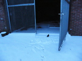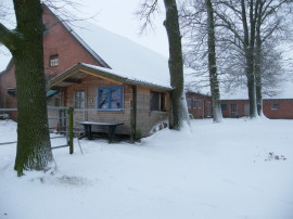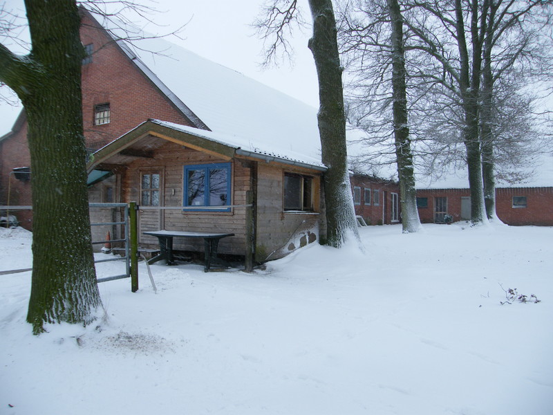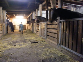 Das Stallgebäude ist auch im Winter nur mit Gittertüren verschlossenen und bei einer Deckenhöhe von 3,7 m annähernd perfekt durchlüftet.